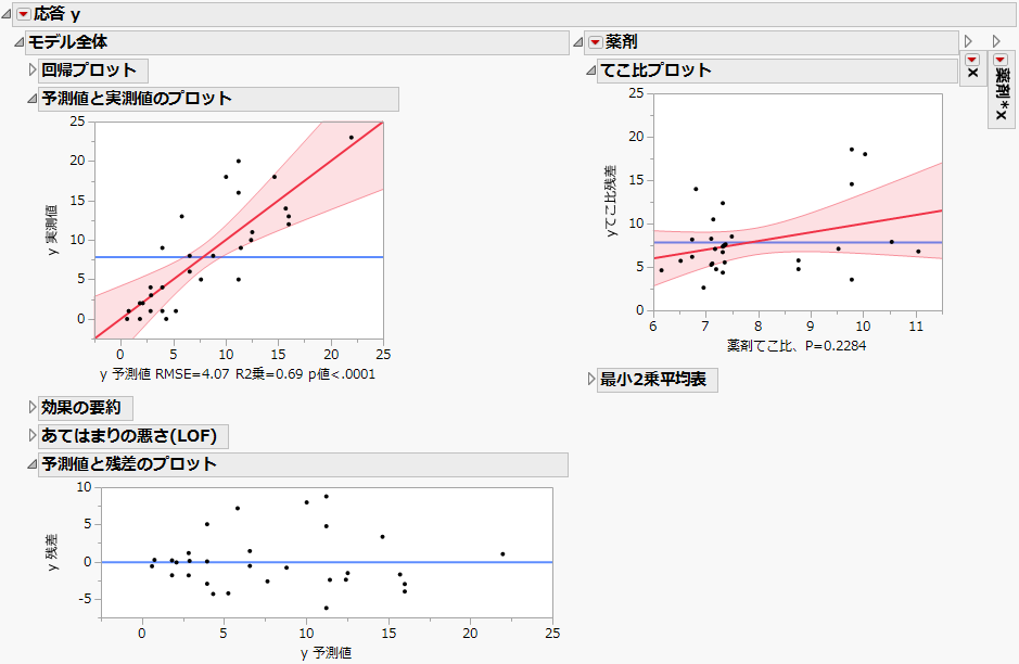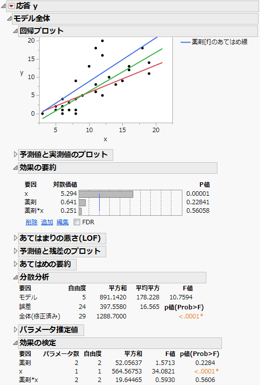 「回帰プロット」では、直線の傾きが異なっており、「薬剤」と処置前値「x」には交互作用があることが示唆されています。しかし、「効果の検定」レポートの「p値(Prob>F)」を見ると、交互作用項は統計的には有意ではありません。また、「x」は有意ですが、「薬剤」は有意ではありません。つまり、このデータからは、3群間の差は検出されませんでした。ただし、この検定結果から直ちに「薬剤には効果がない」と結論付けることはできません。実際には薬剤に何らかの効果があったのに、その効果を検出するのには、データの標本サイズが小さすぎただけかもしれません。