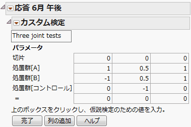 3つの列に、「カスタム検定」における3つの対比の設定に示すとおりに数値を入力します。