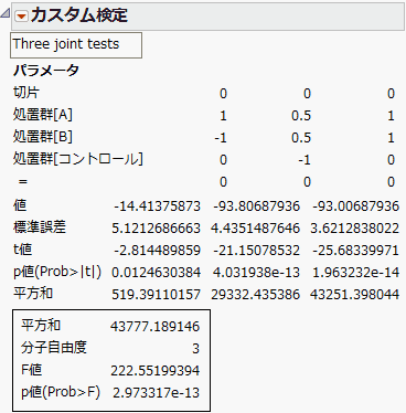 結果には、各対比に対する個々の検定と、すべての対比に対する同時検定が含まれます。「カスタム検定」における3つの対比の設定を参照してください。個々の対比のレポートでは、指定したパラメータの線形関数の推定値とその標準誤差が表示されます。t値、p値、およびそれに関連する平方和も表示されます。個々の対比の結果の下には、すべての対比に対する同時検定の結果の、平方和、分子の自由度、F値、およびそのp値が表示されます。