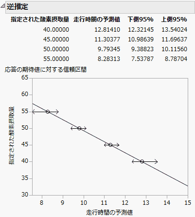 この例では、まず、「走行時間」から「酸素摂取量」を予測する回帰モデルをあてはめます。そして、「酸素摂取量」が特定の値となる「走行時間」を逆推定します。この例では、説明変数が「走行時間」の1変数しかないため、「二変量の関係」プラットフォームの散布図でも、見た目で、大まかな逆推定値を求めることができます。