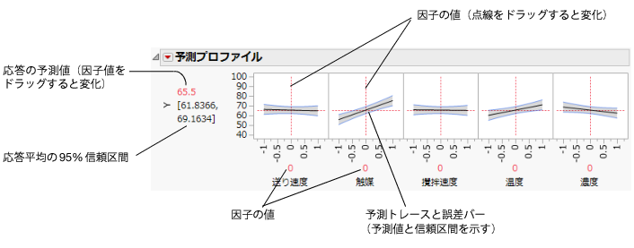 予測プロファイルは、「Reactor.jmp」サンプルデータのプロファイルの一部です。各X変数に対して描かれている縦の点線は、現在の値(現在の設定)を示しています。各グラフは、一度に1つずつ、X変数の値を変化させたときに、応答変数の予測値がどのように変化するかを表しています。