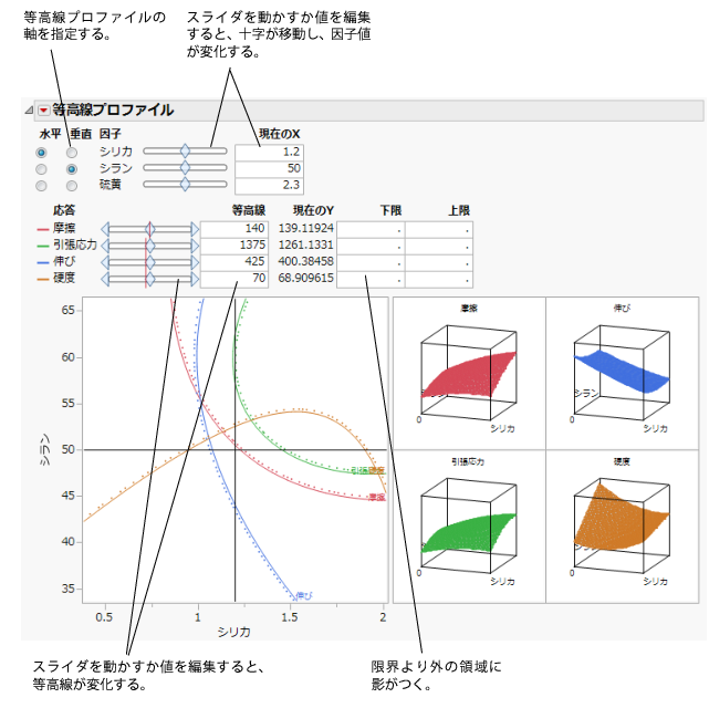 等高線プロファイルは、「Tiretread.jmp」サンプルデータの等高線です。このグラフを作成するには、サンプルデータに添付されている「4応答の応答曲面モデル」スクリプトを実行し、「最小2乗法によるあてはめ」の赤い三角ボタンのメニューから[プロファイル]>[等高線プロファイル]を選択します。