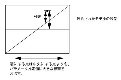 てこ比プロットの仕組みは、てこ比プロットで残差がどのように表現されているかを示しています。点から回帰直線までの距離は、すべての効果を含んだモデルでの残差です。点から水平線までの距離は、その効果がモデルに含まれていないときの残差を表します。つまり、てこ比プロットの水平線は、その効果のパラメータの値が0に制約されているときのモデルを表しています。