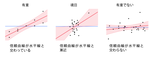 てこ比プロットには、回帰直線に対する信頼曲線が描かれます。この曲線は、検定が5%水準(または、「モデルのあてはめ」起動ウィンドウの[α水準の設定]で指定した水準)で有意かどうかを表したものです。Yの平均を表している水平線が、曲線と曲線の間に含まれているとき、その効果は有意ではありません。曲線が水平線と交差しているときは、効果は有意です。てこ比プロットで示される有意性の例を参照してください。