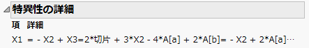 モデル効果の間に一次従属性がある場合、先頭に「特異性の詳細」レポートが表示されます。このレポートには、モデル項の間で成立している線形式が表示されます。この線形式は、モデル項の間の交絡関係を示しています。「特異性の詳細」レポートは、「Singularity.jmp」サンプルデータでの例です。