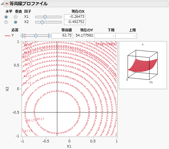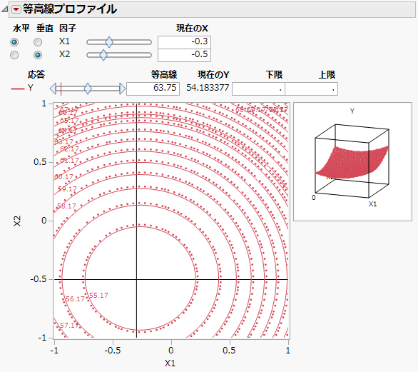 「等高線プロファイル」と「予測プロファイル」を連動させると、「等高線プロファイル」の「現在のX」の値が「予測プロファイル」の「X」の値と連動します。「予測プロファイル」の「X」の値は、「Y」が最小であるときに最適解となります。「等高線プロファイル」の十字ツールは、最適解を示しています。「現在のY」は54.177592で、「予測プロファイル」に従って予測された最小値と一致しています。