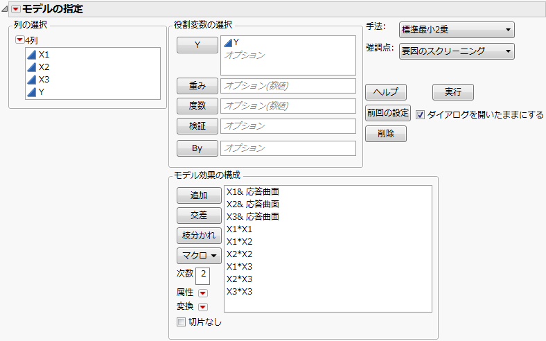 「モデル効果の構成」リストを見ると、主効果の後ろに「&応答曲面」という属性がついていて、[応答曲面]のマクロが適用されていることがわかります。