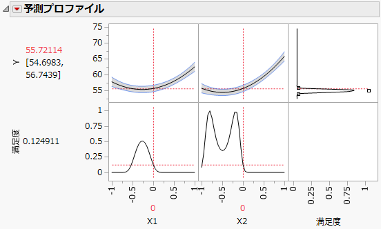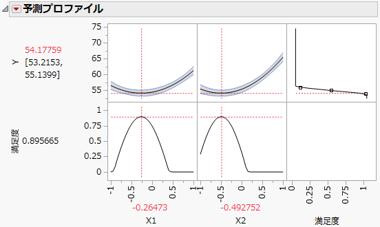 「予測プロファイル」レポートを見ると、「X1」と「X2」においては軌跡がすり鉢状になっているのがわかります。「応答変数の限界」列プロパティが「Y」に設定されているため、プロファイルには満足度関数も表示されます。