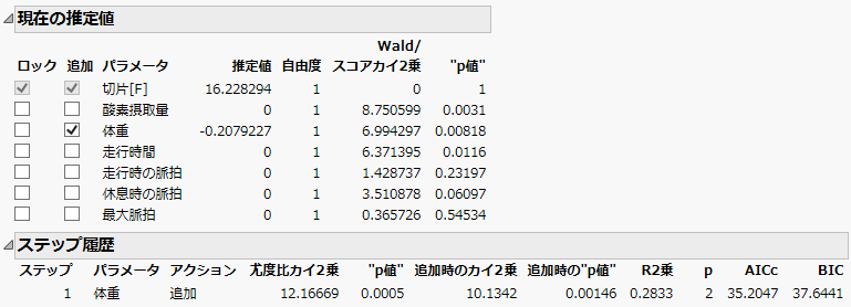 「追加時のカイ2乗」と「追加時の"p値"」(カテゴリカル応答に対するステップ履歴(第1ステップ後)の「ステップ履歴」表の「体重」行)は、説明変数が1つもないモデルでの「Wald/スコアカイ2乗」と「"p値"」(カテゴリカル応答に対するステップ履歴(初期状態)の「体重」行)に一致しています。
