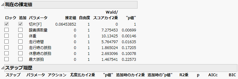 1ステップ実行されるたびに、モデルに追加された項が「ステップ履歴」レポートに記録されます。たとえば、「Fitness.jmp」データの「ステップ履歴」レポートを見ると、項がどの順序でモデルに追加されたかがわかります。第 “ステップワイズ回帰の使用例”を参照してください。