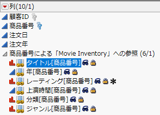デフォルトの列名からは、どのように列が結合されたかがわかります。列名の後ろに、括弧で囲まれた参照列の名前が付いています。たとえば、「Movie Rentals.jmp」のリンクされた列ではタイトルの列名の後ろに参照列[商品番号]が続いています。