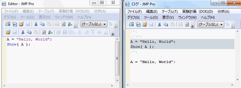 Windowsの場合、ログを表示するタイミングを、JMPが起動したとき、テキストが書き込まれたとき、または明示的に開いたときのいずれかに指定できます。JMPログウィンドウを開く設定を変更するには、[ファイル]>[環境設定]>[Windowsのみ]を選択します。