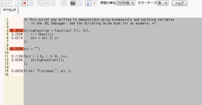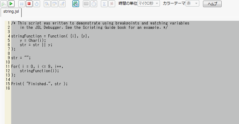 「string.jsl」サンプルスクリプトを開き、[スクリプトのデバッグ]ボタンをクリックします。