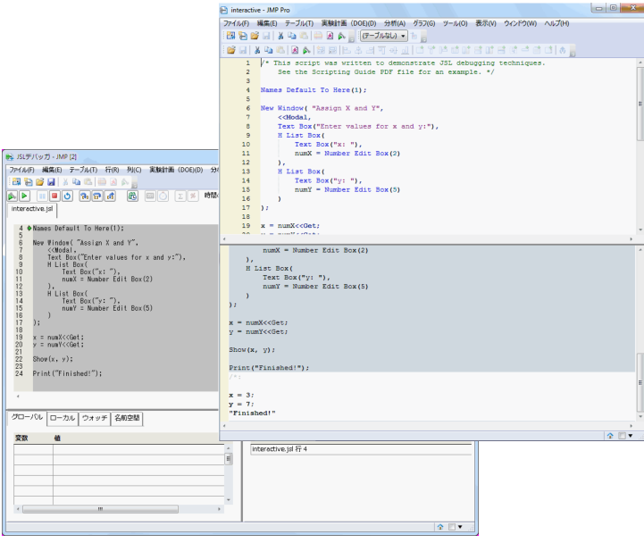 JMPにはスクリプト作成のためのプログラミングツールが用意されています。スクリプトエディタには、構文による色分け、入力のオートコンプリート、対となる括弧の強調表示、コードの折りたたみをはじめ、スクリプトをすばやく作成するための機能が各種用意されています。エラーメッセージやコマンドの戻り値などが出力されるログウィンドウは、スクリプトエディタの中に表示することもできます。JMPスクリプト言語(JSL)デバッガおよびプロファイルは、スクリプトのトラブルシューティングに役立ちます。