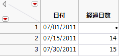 データテーブルの「日付」列に、顧客がクレジットカードを使ってガソリンを購入した日付が入っています。顧客が何日おきにガソリンを購入しているかを知りたいとします。次のスクリプトは「経過日数」列を作成します。その列の計算式は、直前の行の日付値から現在の行の「日付」列の値を引きます。