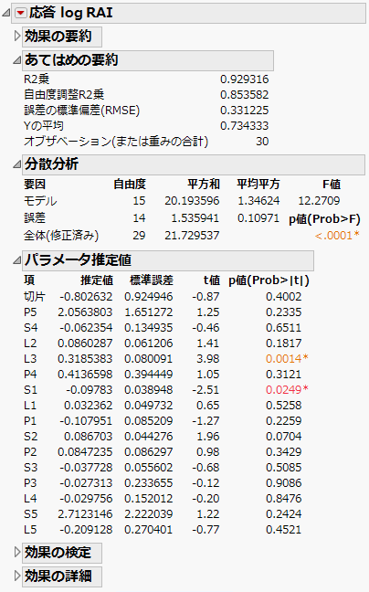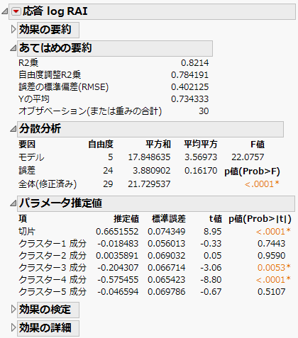この例では、「変数のクラスタリング」プラットフォームによって次元を少なくします。「Penta.jmp」サンプルデータテーブルには、応答変数「log RAI」の予測に使用する15個の変数が含まれています。変数のクラスタリングを使用して、より低次元の合成変数を作成してみましょう。
