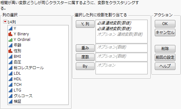 テーブルの「変数のクラスタリング」起動ウィンドウです。