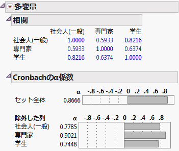 Cronbachのαの結果から(「Cronbachのα係数」レポート)、全体のα係数は0.8666で、3つのグループの評価には高い一貫性があることがわかります。さらに、「専門家」を除いた場合の、「学生」と「社会人(一般)」のCronbachのα係数は0.9021であり、この2名がほぼ同じ評価をしていることがわかります。
