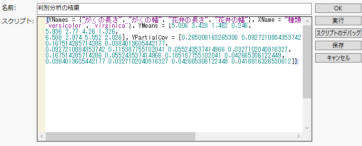 「Iris.jmp」サンプルデータ内の「判別分析」スクリプトで得た分析結果を検討してみましょう。赤い三角ボタンのメニューから[判別行列の保存]を選択すると、データテーブルに「判別分析の結果」という名前のスクリプトが保存されます。「Iris.jmp」の「判別分析の結果」スクリプトは、このスクリプトを示しています。