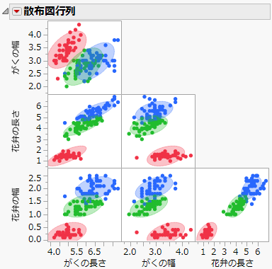 カテゴリカル変数Xの各グループに対して、90%の領域を表す楕円が描かれます。線形判別分析の場合、楕円は、プールした群内共分散行列から計算されています。