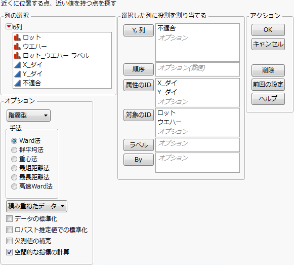 「階層型クラスター分析」プラットフォームでは、[空間的な指標の計算」というオプションを使用できます。この例では、このオプションを使ってウエハーのクラスタリングを行いましょう。このオプションの詳細については、第 “空間的な指標”を参照してください。