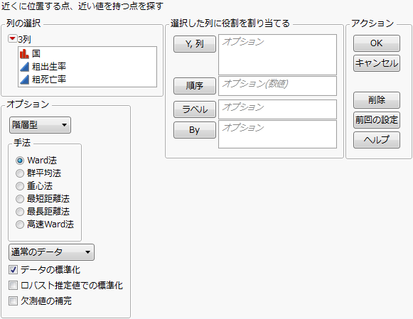 「階層型クラスター分析」プラットフォームを起動するには、[分析]>[クラスター分析]>[階層型クラスター分析]を選択します。「クラスター分析」起動ウィンドウは、「Birth Death Subset.jmp」データテーブルの「クラスター分析」起動ウィンドウです。
