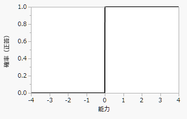 項目反応曲線; item response curve(項目特性曲線; item characteristic curve)は、能力と、各項目との関係を表したものです。項目反応曲線は、さまざまな能力レベルにおける項目の正答率をプロットしたものです。完全な識別力のある項目の特性曲線は、完全な識別力のある項目の項目反応曲線です。ある閾値を下回る能力を持つ受験者は正答率が0%となっています。また、ある閾値を上回る能力を持つ受験者は正答率が100%となっています。
