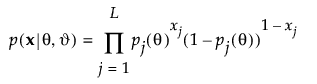 この式で、p(x|θ, ϑ)は、受験者の能力をθ、項目に関するパラメータのベクトルをϑとした場合の、応答ベクトルxが生じる確率です。項目に関するパラメータの個数は、モデル(1PL、2PL、3PL)によって異なります。