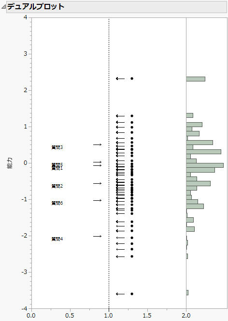軸に示される標準化された共通のスケールが使われています。各項目は、プロットの左側に困難度でプロットされます。各受験者は、プロットの右側に、能力でプロットされ、ヒストグラムも描かれます。デュアルプロットにより、各項目の困難度を各受験者の能力と関連付けることができます。