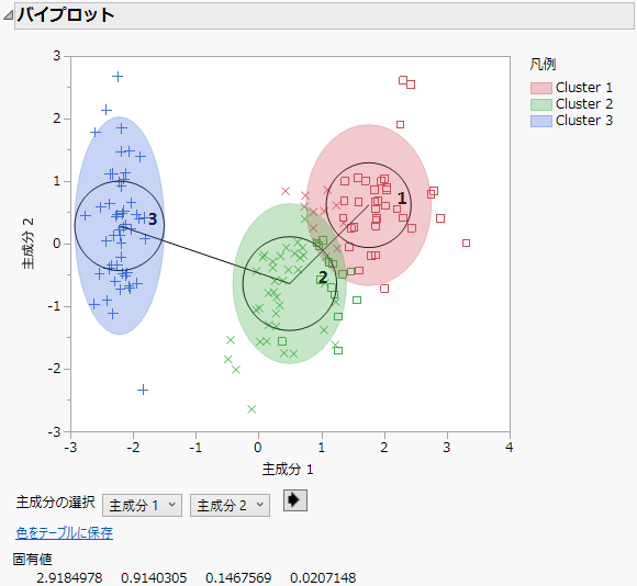 この例では、Iris.jmpサンプルデータテーブルを使用しています。このテーブルには、3種類のアヤメのがくの長さ、がくの幅、花弁の長さ、花弁の幅の測定値が記載されています。