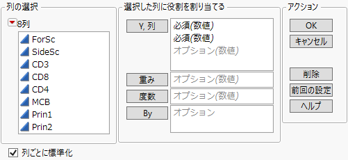 この列の水準に従ってデータがグループ化され、それぞれ個別に分析されます。指定した列の水準ごとに、対応する行が分析されます。分析結果は、個別のレポートにまとめられます。複数のBy変数を指定した場合は、By変数の水準のすべての組み合わせごとに分析が行われます。