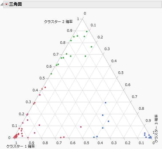 ここでは、車の所有者とメーカーに関する調査データである「Car Poll.jmp」データテーブルを使用します。車の所有者を3つのクラスターに分類し、各クラスターに属する確率を視覚的に表示するプロットを作成します。クラスターが3つの場合は、三角図を使うとわかりやすいです。