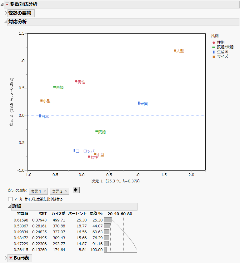 「多重対応分析」レポートは「多重対応分析」レポートのようになります。一部のアウトラインが閉じていることに注意してください。