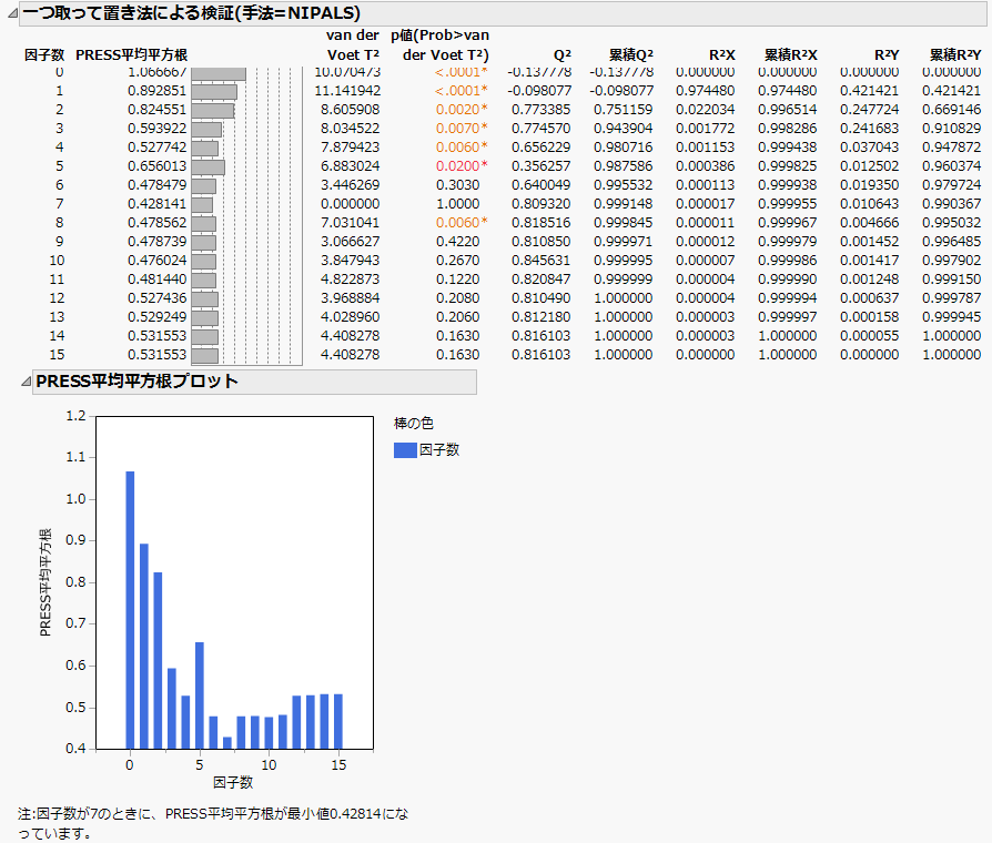 「モデルの設定」パネルで[検証法]として、何らかの検証法を選択した場合には、検証結果のレポートも表示されます。「モデルの設定」パネルでの指定に基づき、0から最大数までの因子の各モデルに関して、要約統計量が表示されます。このレポートには、PRESS平均平方根の棒グラフも表示されます。第 “PRESS平均平方根プロット”を参照してください。PRESS平均平方根が最小になっているモデルが、最適なモデルであると判断できます。