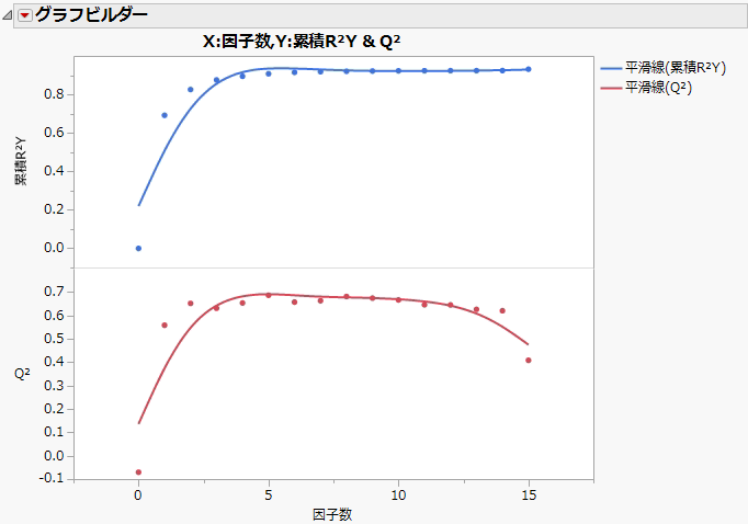 累積R2Yは、因子数が増えるにつれて増加します。これは、より多くの因子がモデルに追加されるにつれて、より多くの変動が説明されるからです。