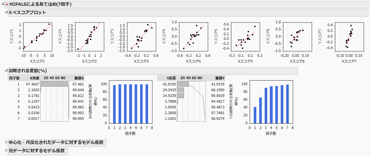 モデルのあてはめ結果に関するレポートには、あてはめたモデルごとに詳細な結果が表示されます。指定された検証法により最適と判断された因子数のモデルがあてはめられます。検証法を指定しなかった場合は、指定した因子数のモデルがあてはめられます。レポートのタイトルには、NIPALSまたはSIMPLSのどちらの手法を用いたかと、あてはめられたモデルの因子数が示されます。
