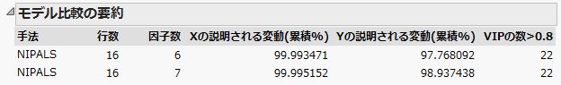 VIP(Variable Importance for Projection; 射影における変数重要度)の値が、0.8よりも大きい説明変数の個数が表示されます。VIPは、XおよびYをモデル化する上で、X変数の重要度を表す指標です(Wold,