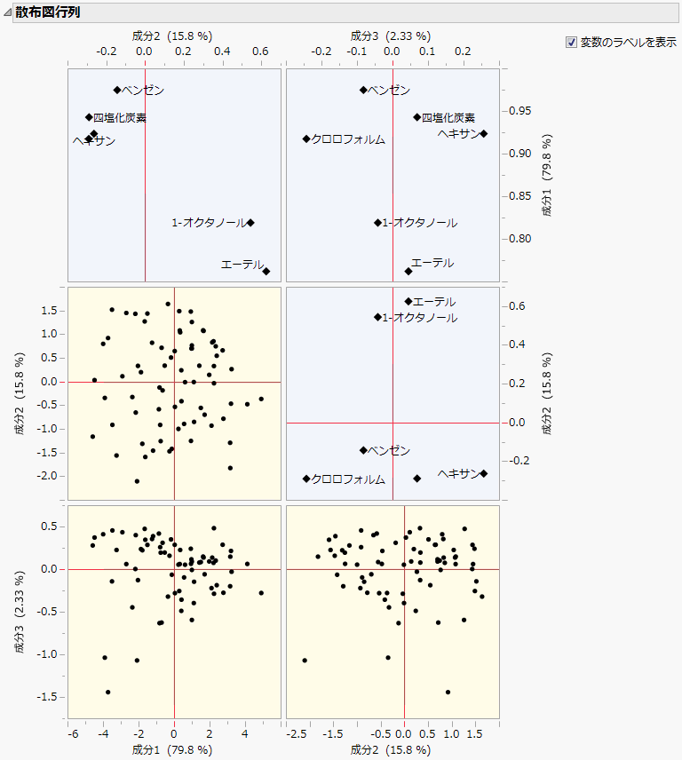 主成分スコアをプロットした散布図行列の表示/非表示を切り替えます。指定した成分数に対する散布図が描かれます。「主成分分析: 相関係数行列から」レポートは主成分スコアをプロットした例です(一番左側のプロット)。