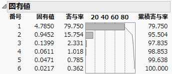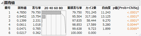 (「横長」または「疎」の推定法では表示されません。)固有値の等質性に対する検定結果の表示/非表示を切り替えます(「固有値」表に追加されます)。この検定では、複数の固有値が等しいかどうかに関する検定に対して、カイ2乗値、自由度(DF)、p値(prob > ChiSq)が計算されます。Bartlett(1937, 1954)を参照してください。