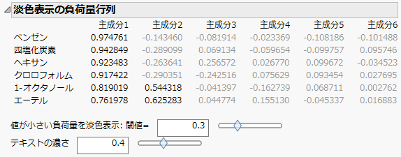 [原点周りの積和行列]オプションを選んだ場合、第i列、第j行の負荷量は、i番目の固有ベクトルにi番目の固有値の平方根を掛けて、j番目の変数の平均積和で割ったものとなります。 ここで言う「j番目の変数の平均積和」とは、積和行列のj番目の対角要素を行数で割った値です(X’X/n)。