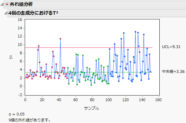 デフォルトでは、「外れ値分析」のプロットには、主成分分析の結果から計算されるT2が描かれます。このプロットは、中央値(メディアン)と上側管理限界(UCL)が水平線で描かれ、各行のT2値がプロットされます。表示します。T2値、中央値、UCLの計算法の詳細については、第 “外れ値分析の計算”を参照してください。