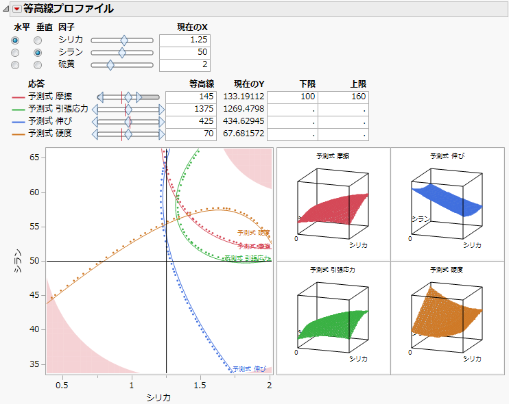 この例では、「Tiretread.jmp」サンプルデータを使用します。3つの因子(「シリカ」、「シラン」、「硫黄」)と、4つの応答(「摩擦」、「引張応力」、「伸び」、「硬度」)があります。このデータテーブルには、4つの応答変数の予測式があらかじめ列に保存されています。