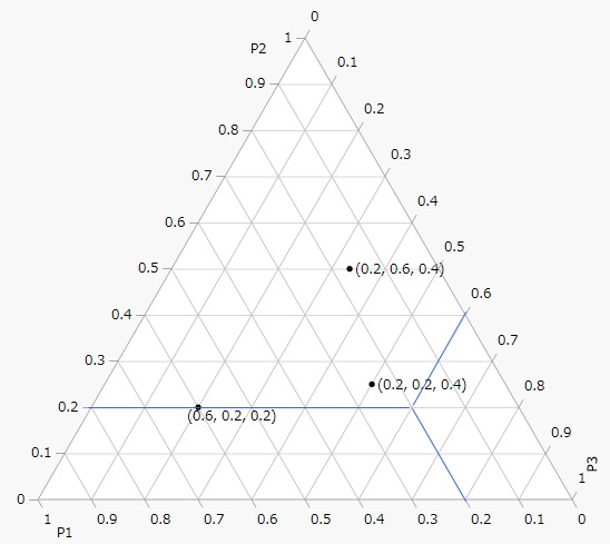 は、3つの配合成分P1、P2、P3を描いた△図です。この3つの配合成分には制約がなく、いずれも0 (0%)~1(100%)の割合を占めることができます。3つの点が、その座標(P1, P2, P3)とともにプロットされます。(0.2, 0.2, 0.6)の点からは青い線が表示されています。、この青い線を辿ると、各配合成分の軸における座標が分かります。