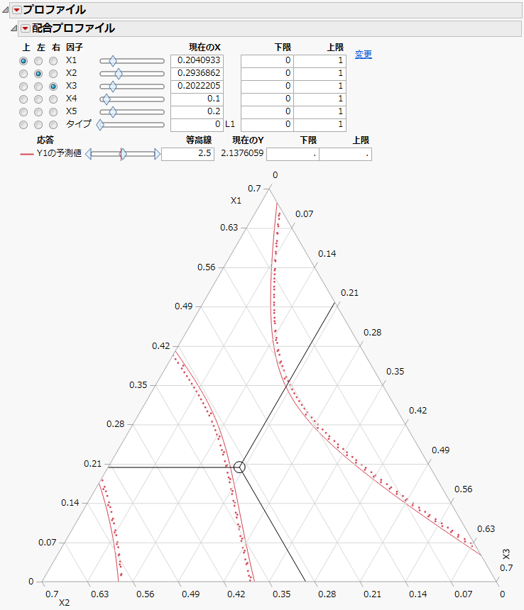 非表示の因子の値を反映し、軸のスケールが変更された三角図は、因子が5つある配合計画の配合プロファイルの三角図です。「Five Factor Mixture.jmp」データテーブルを使い、「Y1の予測値」列を計算式としています。プロットに表示されている因子は、x1、x2、x3の3つで、x4とx5は表示されていません。この例の配合成分には制約はありません。つまり、すべての下限値は0に設定され、すべての上限値は1に設定されています。x4の値は0.1、x5の値は0.2で、合計0.3になっています。この場合、x1、x2、x3の合計は、1-0.3 = 0.7に等しくなります。プロット軸の最大値が1ではなく0.7になっていることに注意してください。