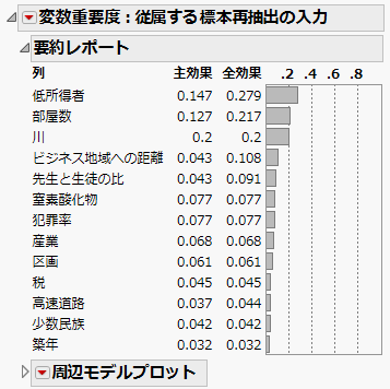 「変数重要度: 従属する標本再抽出の入力」レポートが表示されます(「従属する標本再抽出の入力」レポート)。「予測プロファイル」のセルの並び順が、レポートの「全効果」の値の大きい順に変化している点を確認してください。「従属する標本再抽出の入力」レポートの「全効果」の値から、「部屋数」と「低所得者」が応答の予測値に大きい影響力を持つ因子だと判断できます。