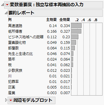 因子間の相関がなく、分布が一様分布でない場合には、この[独立な標本再抽出の入力]オプションを用いるのが良いでしょう。「変数重要度: 独立な標本再抽出の入力」レポートを「独立な標本再抽出の入力」レポートに示します。ここでも、予測値に対する寄与率の高い因子として「高速道路」と「低所得者」の2因子を確認できます。