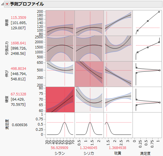 「Tiretread.jmp」サンプルデータは、直交表を使った実験計画の結果です。直交表を用いているので、因子間の相関はありません。ここでは、因子の値は、計画で定義したものだけではなく、計画領域の範囲で自由に調整できるとします。このような場合は、重要度の計算に用いるシミュレーション法として[独立な一様分布の入力]を選択します。
