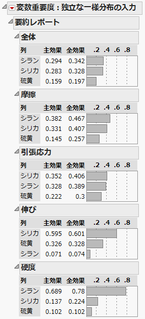 レポートには、4つの応答ごとに1つずつ表が表示されます。「全体」表には、因子重要度の4応答間の平均が表示されます。「予測プロファイル」の因子(4応答の予測プロファイル)は、「全体」表の「全効果」に示される重要度の値に従って並べ替えられます。