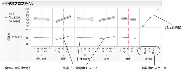 このコマンドによって、プロット行列の一番下に新しい行が追加され、満足度をグラフ化したものが表示されます。予測プロファイルの満足度関数にあるとおり、この行は各因子の満足度トレースを示すプロットから成ります。さらに、各Y変数の満足度関数を調整するための列も追加されます。全体の満足度の値は、満足度トレースの行における縦軸の左側に0~1の範囲で表示されます。