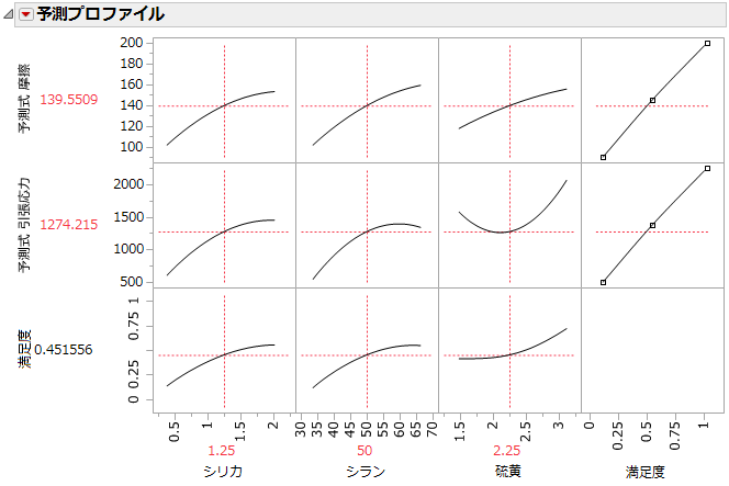 たとえば、予測プロファイルにおける満足度は、2つの応答変数に対する満足度を示しています。この例では、「摩擦」と「引張応力」を最大化するのが目的です。満足度のトレースを見ると、「シリカ」、「シラン」、「硫黄」を高くすると満足度が上がることがわかります。